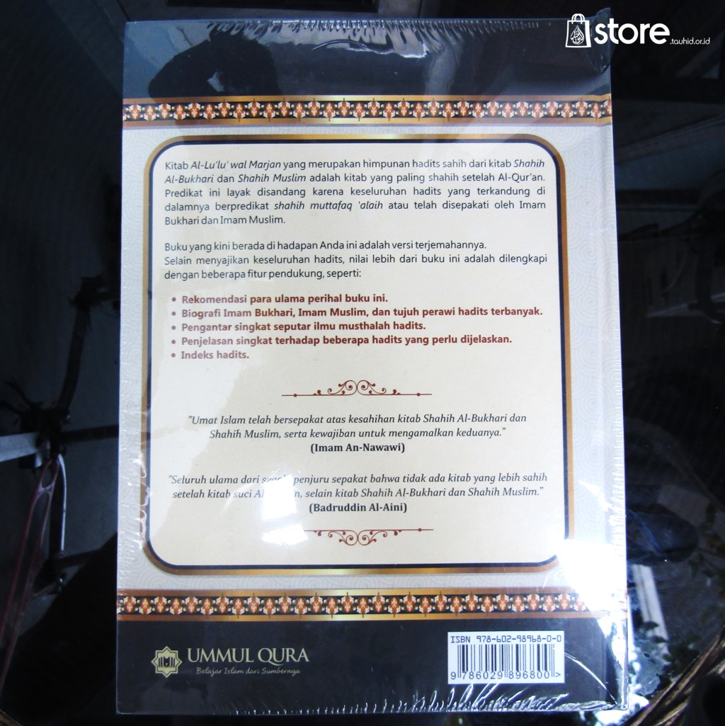 | Sangat direkomendasikan bagi kaum muslimin karena merupakan himpunan hadits shahih dari kitab Shahih Al-Bukhari dan Shahih Muslim adalah kitab yang paling shahih setelah Al-Qur'an. Predikat ini layak dipandang karena keseluruhan hadits yang terkandung di dalamnya berpredikat shahih muttafaq 'alaih atau telah disepakati oleh Imam Bukhari dan Imam Muslim. ISBN 9 78602 98968 00 Ukuran 17,5cm x 24,5 cm Jenis Cover Hard Cover Berat 1400gr Jumlah Halaman 1184 Halaman |